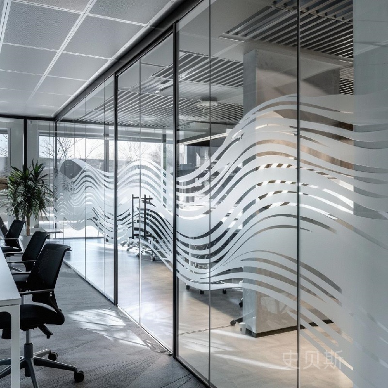 另一张图片展示了一个带有玻璃隔断的会议室,隔断上装饰着精美的图案,为会议增添了一抹艺术气息。这样的隔断不仅实用,还能够成为讨论区的一部分,增加互动性。